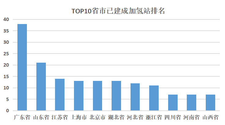 全國(guó)前10大已建成加氫站省市區(qū),按數(shù)量排名如下: