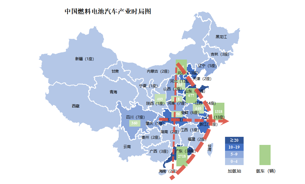 將燃料電池汽車(chē)和加氫站數(shù)據(jù)信息疊加在一起,就構(gòu)成了中國(guó)燃料電池汽車(chē)產(chǎn)業(yè)時(shí)局圖。