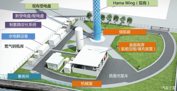 為解決這一問題,豐田在2015年聯合日本橫濱/川崎市政府、巖谷產業、東芝、豐田自動織機等多家機構與企業,在橫濱風力發電站(Hama Wing)開展了風力發電制造低碳氫燃料的實證實驗項目。項目的主要內容就是通過風力發電制取真正的“低碳氫”,并將氫氣供應給橫濱、川崎兩地四家企業的12輛氫燃料電池叉車,從而對整個氫能供應鏈進行初步摸索,并對供應鏈廣泛推廣的可行性進行評估。在不久前的10月份,我曾親自前往Hama Wing進行了參觀。關于這套氫能供應鏈的細節,請隨我一起往下看吧。