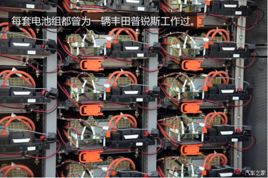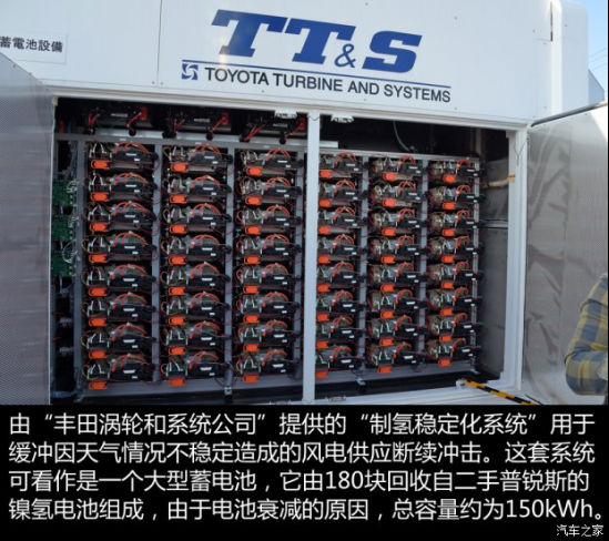 180塊回收自二手普銳斯的電池組構成了這個“大蓄電池”,由于風力發電非常容易受天氣影響——在風速過小或過大時,風力發電機都無法工作。因此,這個“大蓄電池”就用于緩沖、消除由于風力發電機工作斷續帶來的供電波動,保證下方的水電解制氫裝置可以得到持續的供電。