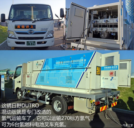 基于上圖三個裝置,氫氣完成了生產(制備)和包裝(壓縮)過程,接下來的環節就是將壓縮氫氣運輸至需求方,而載具則是下圖中這輛日野DUTRO Hybrid運氫車。