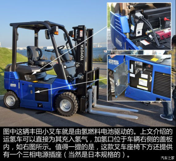 豐田在橫濱市中央批發市場本場蔬果部、麒麟啤酒橫濱工廠、日冷物流東扇島物流中心、中村物流川崎FAZ物流中心四家企業投放了12輛氫燃料電池叉車進行試點,分別用于短距離多頻次、重物搬運,以及低溫工作環境的驗證和測試。這款叉車充滿氫所需的時間約為3分鐘,可以支持其工作約8小時,無需像傳統純電動叉車一樣充電或換電池。